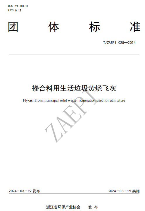 《摻合料用生活垃圾焚燒飛灰》標(biāo)準(zhǔn)號(hào)T/ZAEPI 025-2024,該標(biāo)準(zhǔn)由浙江京蘭環(huán)??萍加邢薰竞驼憬髮W(xué)主編,由浙江省環(huán)保產(chǎn)業(yè)協(xié)會(huì)于2024年3月19日批準(zhǔn)發(fā)布,2024年3月19日起實(shí)施。文件規(guī)定了摻合料用生活垃圾焚燒飛灰的術(shù)語(yǔ)和定義、技術(shù)要求、試驗(yàn)方法、檢驗(yàn)規(guī)則、包裝、標(biāo)志、運(yùn)輸和貯存。文件適用于低溫?zé)岱纸饧八唇舛竟に囂幚砗蠓?HJ 1134規(guī)定的摻合料用生活垃圾焚燒飛灰,為后續(xù)飛灰處理產(chǎn)物的產(chǎn)品化進(jìn)一步拓寬了應(yīng)用場(chǎng)景。